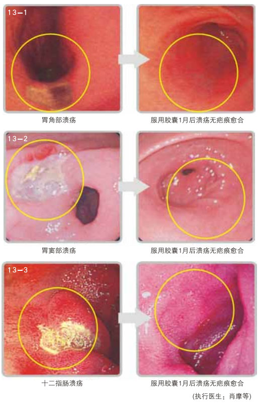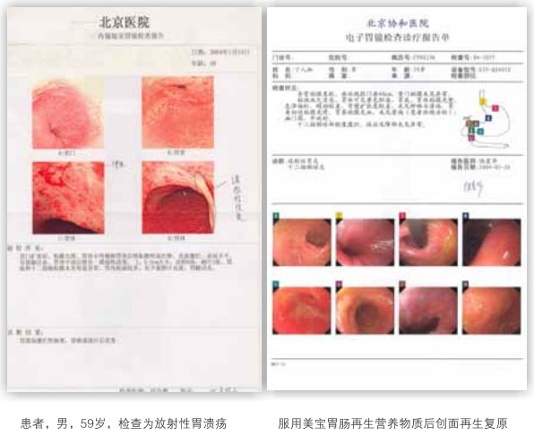 2. 胃肠溃疡:这些疾病,,,, ,,现在医学上接纳的是疤痕修复溃疡创面,,,, ,,从而导致复发不愈。。。。。。。接纳本再生疗法,,,, ,,新的胃肠粘膜可从溃疡的创面上原位再生出来,,,, ,,取代了溃疡创面,,,, ,,没有疤痕,,,, ,,彻底治愈了胃肠溃疡。。。。。。。(图13 为胃镜图片)
