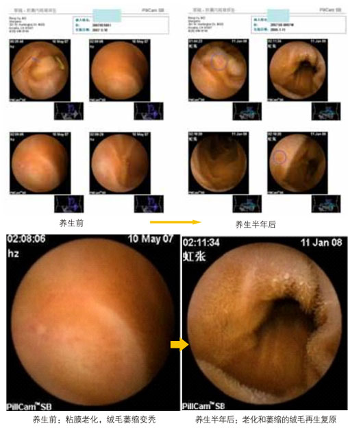 3. 朽迈的胃肠粘膜再生回复:朽迈的胃肠粘膜能回复回较年轻的粘膜,,,, ,,这在医学和保健学上,,,, ,,从没有人想到。。。。。。。而在本研究的再生回复疗法上,,,, ,,已经实现了。。。。。。。我们的研究批注,,,, ,,人过40岁,,,, ,,人的胃肠粘膜等最先走向朽迈,,,, ,,其朽迈程序的启动比任何器官都早,,,, ,,过了50岁,,,, ,,人的胃肠粘膜就有约一半的细胞不施展应有的功效,,,, ,,并且朽迈和凋亡了,,,, ,,到90岁,,,, ,,有功效的细胞也执伲下不到10%。。。。。。。我们的研究临床应用效果批注,,,, ,,只要举行半年的胃肠再生回复养生,,,, ,,朽迈的胃肠粘膜就能原位再生回复,,,, ,,此后继续坚持再生回复养生,,,, ,,就能包管胃肠功效维持在正常较年轻的状态。。。。。。。(图14 为肠镜图片)