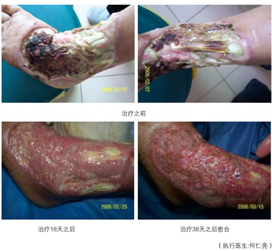 糖尿病溃疡是当今天下还没有有用治疗要领的溃疡, ,,,, ,,,本研究再生疗法已乐成地对这一溃疡像治疗一样平常创面那样, ,,,, ,,,原位再生新的组织, ,,,, ,,,使溃疡再生愈合, ,,,, ,,,阻止了截肢残废。。。。。。动脉闭塞性肢体远端坏死溃疡更是天下医学治疗的难题, ,,,, ,,,本研究仍可实现创面的再生回复愈合。。。。。。