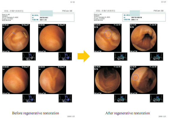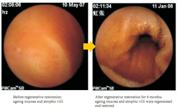 From the above introduction, it is clear that the diseased or apoptosic cells can be replaced by regenerated cells, then how about the aged cells?  You can find the answer in the following case.  According to the results of the gastroscopy before regenerative restoration on May 10th 2007, parts of the villi exfoliated and all villi turned atrophy.  After 6 months regenerative restoration, the new gastroscopy results showed that most of the gastrointestinal villi were regenerated and the GI tract returned to the younger state.  We realized this without precedent in the history.  All our club members here will have the same change through the course of regenerative restoration, since an 80-year-old senior could have part of villi regenerated.  Gastrointestinal regeneration, the true reflection of organ regeneration, is even more important than severed finger regeneration, because it is the precondition for the regeneration and renewal of other internal organs.  Another example: a patient with 12-year history of coronary heart disease is cured by systemic regenerative restoration, which indeed gave the doctors a shock.  That is a convincing example to show that all other organs of the human body can be repaired through the functional improvement of the GI tract.  After the improvement of the GI tract, the quality of life still can be improved a lot even though regenerative nutrients are replaced by common food.