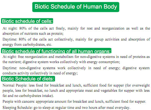 In the following part, I will give an illustration of our working and resting timetable, and the time of food going down after meal.  Two hours are needed to empty the human stomach, so after having dinner at 6 o’clock, the time for emptying the stomach should be reserved, so people should go to sleep after 8 o’clock so as to have a comfortable feeling when the stomach is emptied.  Then the food will stay in the small intestine for 4-6 hours to be digested and absorbed.  This is why people have to take three meals every day to maintain the adequate nutrients for the body.  The GI tract is restless all day due to the digestion and absorption of breakfast, lunch and dinner.  Therefore, I proposed the conception of the work and rest timetable of GI tract, which suggests less eating during the day to make the gastrointestinal less burdened and less energy consumed and heavy eating before sleeping when the other organs consume less energy, and the GI tract can digest food and absorb the nutrition well.  The bioclock diet we have proposed is high quality eating in the morning, less eating at noon, and heavy eating (protein) in the evening.