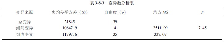 组间和组内离均差平方和除以响应的自由度,,,,,,即得“组间均方”和“组内均方”。。。。。。。。以组内均方除组间均方所得之商即为F值。。。。。。。。方差剖析模式于下(表382):