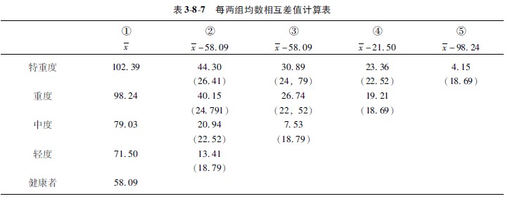 5效果判断与剖析:凭证表388中的数据,,,,,,判断剖析康健人与烧伤病人血清肌酸含量平均数有无显著差别。。。。。。。。由表388②和③栏得知,,,,,,轻度与中度烧伤病人肌酸含量均数的差值均小于Q×sx值(13,,,,,,41<1879;;;;; ;;;753<1879),,,,,,即康健者同轻度与中度烧伤组之间无统计学差别。。。。。。。。由③栏看出,,,,,,重度与特重度病人肌酸含量均数的差值均大于Q×sx值(4015>2479;;;;; ;;;4430>2641),,,,,,故以为他们之间有显著性差别。。。。。。。。由第③栏得知,,,,,,中度烧伤病人均数的差值小于Q×sx值,,,,,,与康健者无统计学差别;;;;; ;;;而重度与特重度病人肌酸含量之间均数差值均大于Q×sx值(2674>2252;;;;; ;;;3089>2479),,,,,,故以为轻度与中度烧伤病人血清肌酸含量与康健人之间无统计学差别,,,,,,重度与特重度烧伤病人血清肌酸含量与轻度和中度烧伤病人有显著差别,,,,,,而特重度病人肌酸含量也显著高于重度病人。。。。。。。。