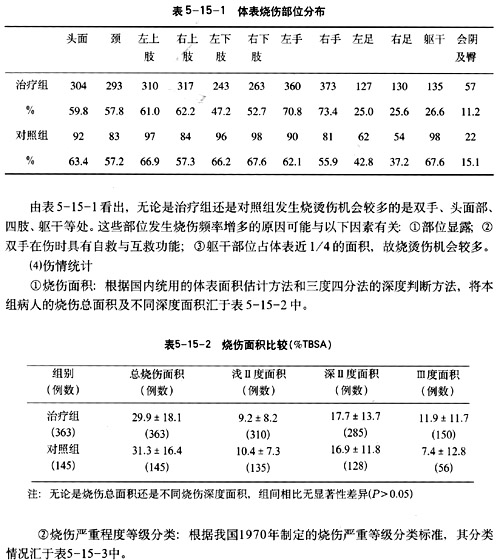 由表5-15-3看出,,,,,两组病人重度和特重度烧伤均占较高比例,,,,,即治疗组烧伤总面积大于50%BSA者,,,,,或是Ⅲ度烧伤面积凌驾20%BSA者已达75例;;;;;比照组31例,,,,,划分占各组例数的20.7%和21.3%,,,,,或者说,,,,,两组重度以上烧伤病例已凌驾或靠近总例数的40%。。。。。。。他们中最大烧伤面积者达94%BSA,,,,,同时Ⅲ度面积达73%BSA。。。。。。。由此说明,,,,,无论是治疗组照旧比照组,,,,,伤情都是相当严重的,,,,,而现在在海内外的治疗难度也是相当大的。。。。。。。
