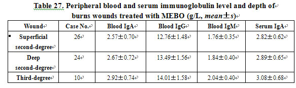 The deeper the burns wounds treated with MEBO, the higher the level of peripheral blood and serum Ig, but no statistical difference (P>0.05). MEBO enhanced the immunity of peripheral blood and serum of patients with different burn depths (Table 27).