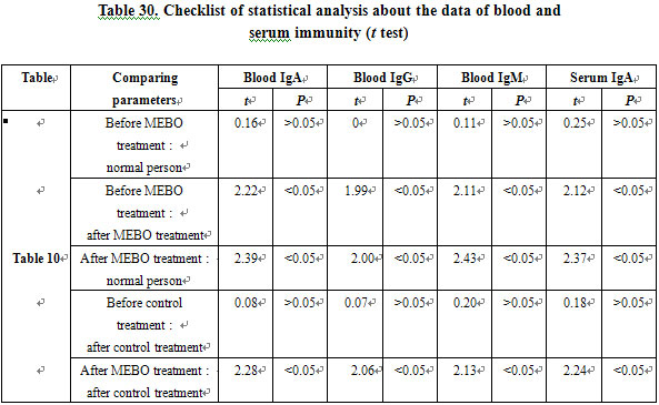 There was no significant difference in peripheral blood IgA, IgG, IgM and serum IgA levels between burns patients and normal persons (P>0.05). After treated with MEBO, peripheral blood IgA, IgG, IgM and serum IgA levels were significantly higher than those of before treatment and those in the control group and normal persons (P<0.05), while in the control group, the before and after treatment difference was not significant (P>0.05). MEBO significantly raised the levels of peripheral blood and serum immunoglobulin (Table 26).