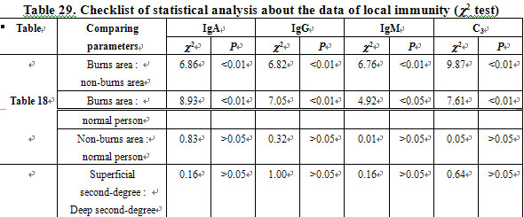 IgA-, IgG-, and IgM-producing cells and C3 in the burns area had higher staining intensity compared to those of the non-burns area and to those of normal persons (P<0.01). The immunity of the local area changed postburn. Immunologic function and reaction were enhanced. In the non-burns area, the immunity was similar to that of normal persons. The difference was not marked (P>0.05; Table 18).
