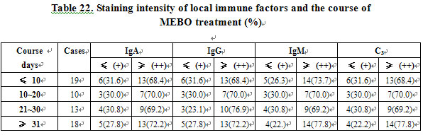 There was no significant correlation between staining intensity of local IgA-, IgG-, ad IgM-producing cells and C3, and the duration of MEBO treatment (P>0.05). The immunity of the patients was enhanced, irrespective of the duration of the treatment (Table 22).