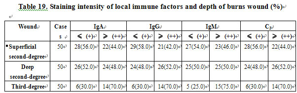 Local immunity was closely related to burn depth. IgA-, IgG-, and IgM-producing cells and C3 in the local area of third-degree burns wounds had stronger staining intensity than those in superficial second-degree burns wounds (P<0.05). The deeper the wound, the stronger the staining intensity (Table 19).