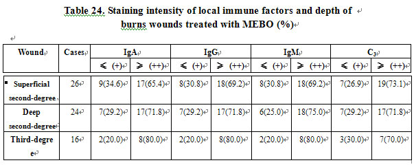 After treatment with MEBO, the deeper the burn wound, the stronger the staining intensity of local IgA-, IgG-, and IgM-producing cells and C3, but no statistical difference (P>0.05). MEBO enhanced the local immunity of different depths of burns wounds (See Table 24).
