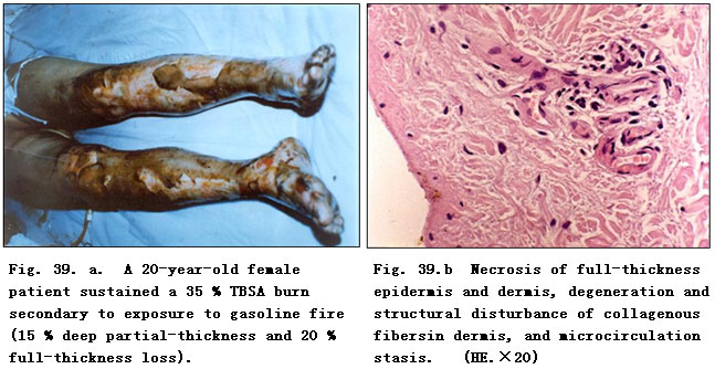 A 20 year-old female patient sustained a 35% TBSA burn secondary to exposure to gasoline fire (15% deep partial-thickness and 20% full-thickness loss). The patient was hospitalized at 12 h postburn and was diagnosed as suffering with full-thickness loss (III-degree) burns on both lower extremities. The epidermis was necrotic and detached and the dermal layer degenerated and necrotic with a waxy yellow and waxy white appearance (Fig.39.a). The pathological section examination of the sampled local wound tissues revealed necrosis of full-thickness epidermis and dermis, degeneration and structural disturbance of collagenous fibers in dermis, and microcirculation stasis (Fig.39. b).
