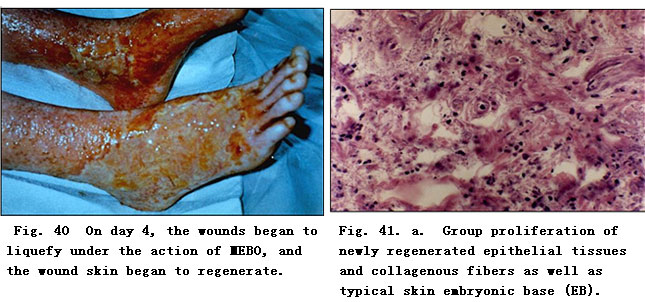 Repeat biopsy at the same burned location was performed for pathological examination.  The results showed massive granular tissues among the necrotic epithelial tissue, ,,,,a proliferation of newly regenerated epithelial cells with collagenous fibers, as well as the typical skin embryonic base (EB, Fig. 41. a,b). After a 10-day application of MEBO, the comparably primitive epithelial tissues were observed under pathological examination of epithelial tissues sampled from the wound edge.