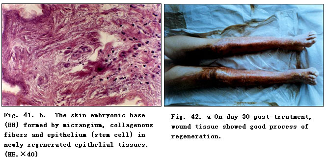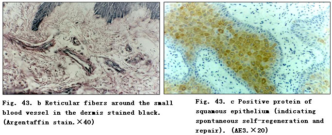 Twenty days post-treatment with BRT with MEBT/MEBO, wound tissue was examined and the results showed the clear appearance of collagenous fibers in epithelial tissue and subcutaneous tissue. Argentaffin stain indicated active regeneration of reticular fibers.  The reticular fibers around the small blood vessels of subcutaneous tissue appeared relatively normal. The basal cells of epidermis regenerated actively (Fig. 43. a,b).