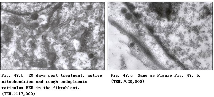 Twenty days post-treated, we noted the appearance of the hemidesmosome junction between the basal cell layer and epithelia. Active mitochondria and RER in fibroblasts also appeared (Fig. 47. a-c).